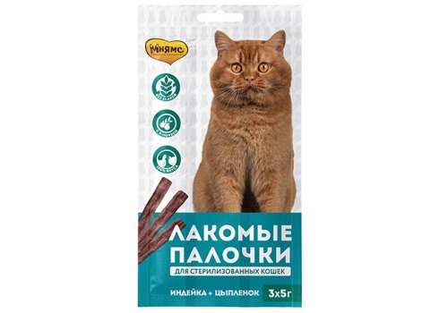Мнямс Лакомство для Стерилизованных кошек Лакомые палочки 13,5 см Индейка и Цыпленок 5г х 3шт