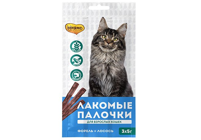 Мнямс Лакомство для кошек Лакомые палочки 13,5 см Лосось и Форель NEW 5г х 3шт