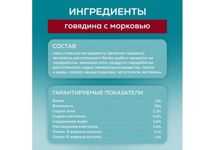 Мясо и мясные ингредиенты (в том числе говядина), экстракты растительного белка, рыба и продукты ее переработки, продукты переработки растительного сырья, аминокислоты, минеральные вещества, масла и жиры, овощи (морковь), загустители, сахара, витамины.