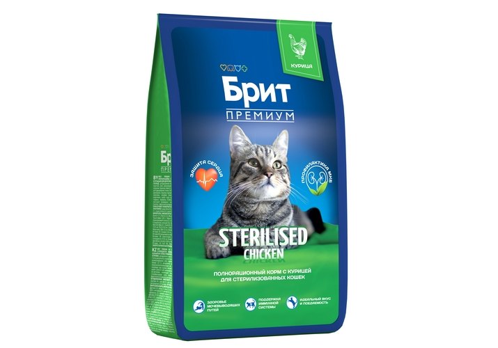 Brit Premium Sterilised Chicken. Полнорационный сухой корм премиум класса с курицей для взрослых стерилизованных кошек.