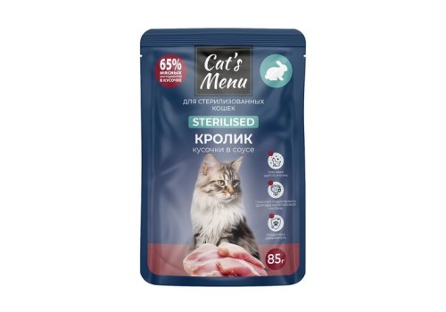 Cats Menu Паучи Кэтс Меню для взрослых Cтерилизованных кошек с Кроликом кусочки в соусе (цена за упаковку) 85г х 30шт
