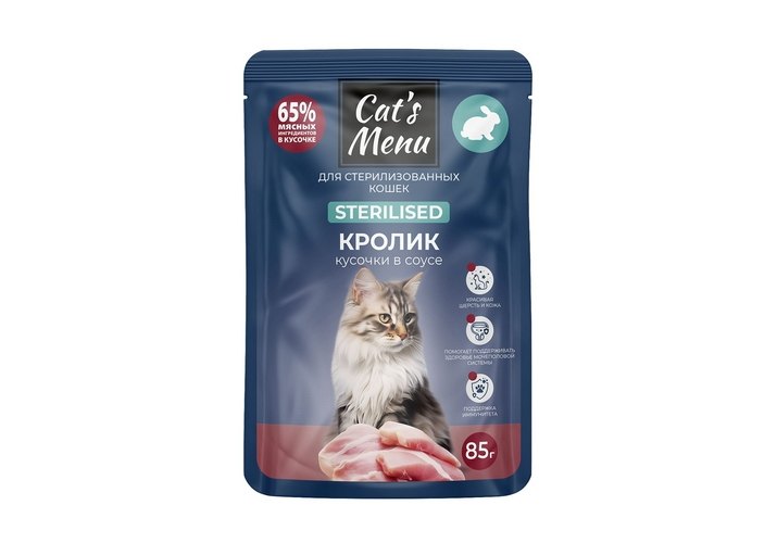 Главная////Для Cats Menu/Для взрослых кошек/Консервы/Cats Menu / Паучи Кэтс Меню для взрослых Cтерилизованных кошек с Кроликом кусочки в соусе (цена за упаковку)