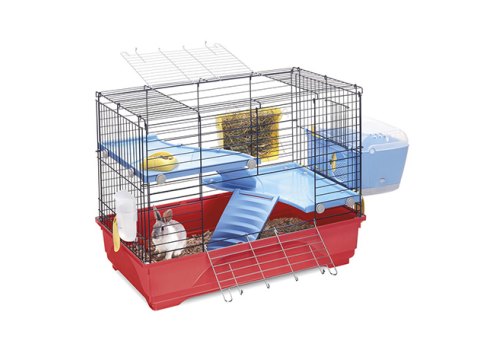 Клетка для крупных грызунов Imac Benny 80 – для хорьков, морских свинок и кроликов подойдет для одного или нескольких питомцев. В этой клетке предусмотрены 2 платформы, которые можно устанавливать на любую высоту и 2 лесенки по которым питомцы могут забираться на них. Также в комплект входит кормушка, устанавливаемая снаружи клетки, поилка, миска и домик. Прутья клетки покрыты двойным гальваническим покрытием, обеспечивающим долгий срок службы, основание клетки сделано из высококачественного пластика красного цвета, приятного оттенка. Клетка оборудована 2мя дверцами, расположенными на крыше и на фронтальной части клетки для легкого и удобного доступа к питомцам. Расстояние между прутьями 26 мм. Дополнительно можно докупить подставку на колесиках.