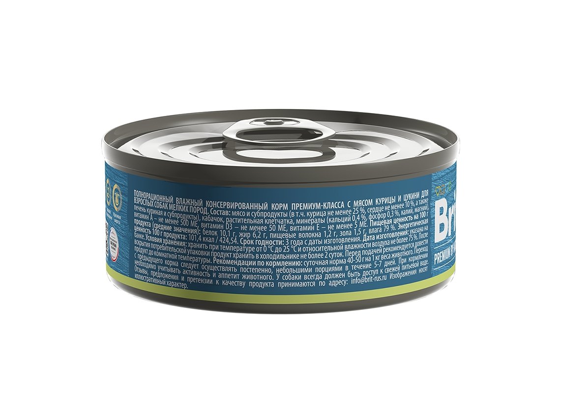 Полнорационный консервированный корм премиум класса курица с цукини для взрослых собак мелких пород.