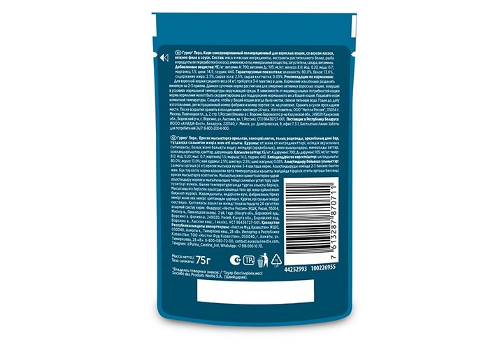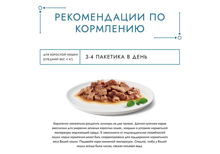 Для взрослой кошки среднего веса (4 кг) требуется 3-4 пакетика в день. Кормление желательно разделить минимум на два приема. Данная суточная норма рассчитана для умеренно активных взрослых кошек, живущих в условиях нормальной температуры окружающей среды. В зависимости от индивидуальных потребностей кошки норма кормления может быть скорректирована для поддержания нормального веса Вашей кошки. Следите, чтобы у Вашей кошки всегда была чистая, свежая питьевая вода.