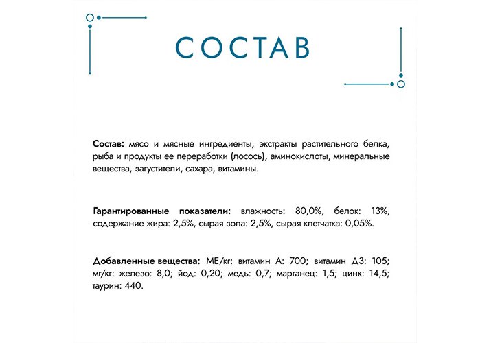 Мясо и мясные ингредиенты, экстракты растительного белка, рыба и продукты ее переработки (лосось), аминокислоты, минеральные вещества, загустители, сахара, витамины.