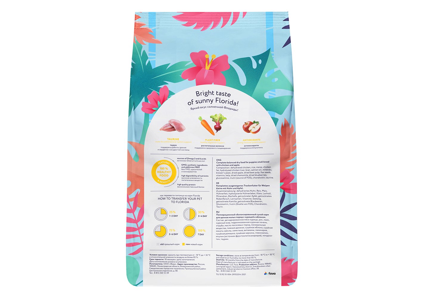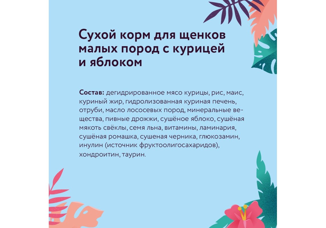 Сбалансированное полнорационное питание, способствующее гармоничному развитию щенка. В рационе кормов Florida используется только белок животного происхождения.