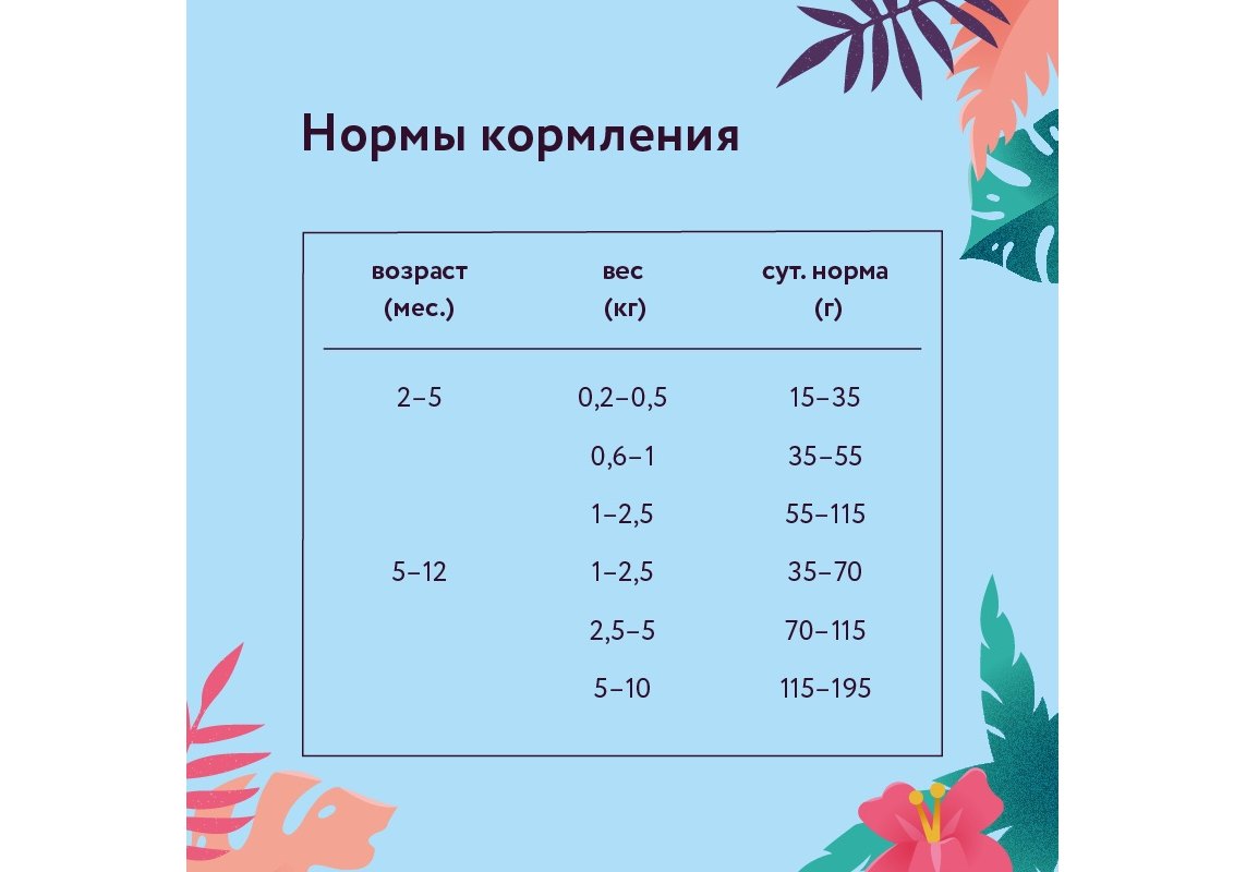 Данные нормы являются ориентировочными. Суточные потребности в питании могут варьировать в зависимотсти от возраста, породы, комплекции и уровня активности питомца.