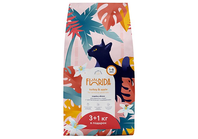Florida Turkey & Apple - сухой корм супер-премиум-класса с индейкой и яблоком для взрослых кошек с чувствительным пищеварением в возрасте от 1 до 8 лет.