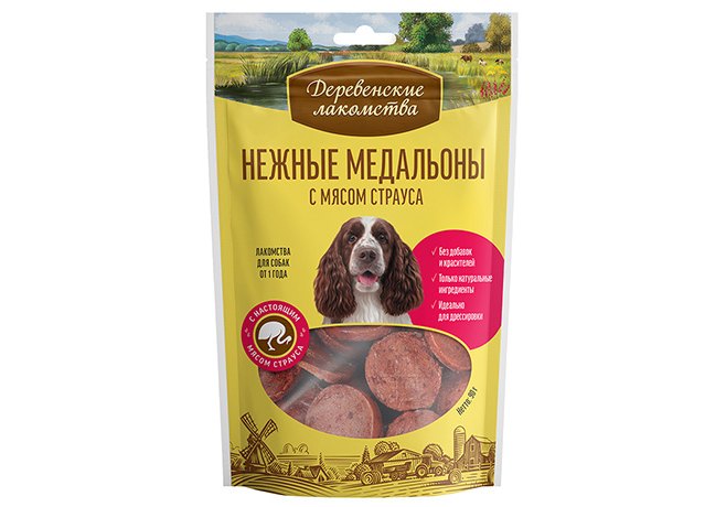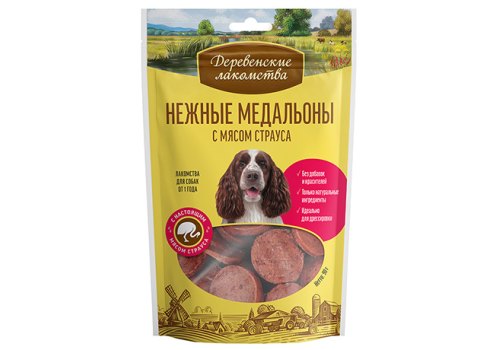 Деревенские лакомства Нежные медальоны для собак с мясом Страуса 90 г