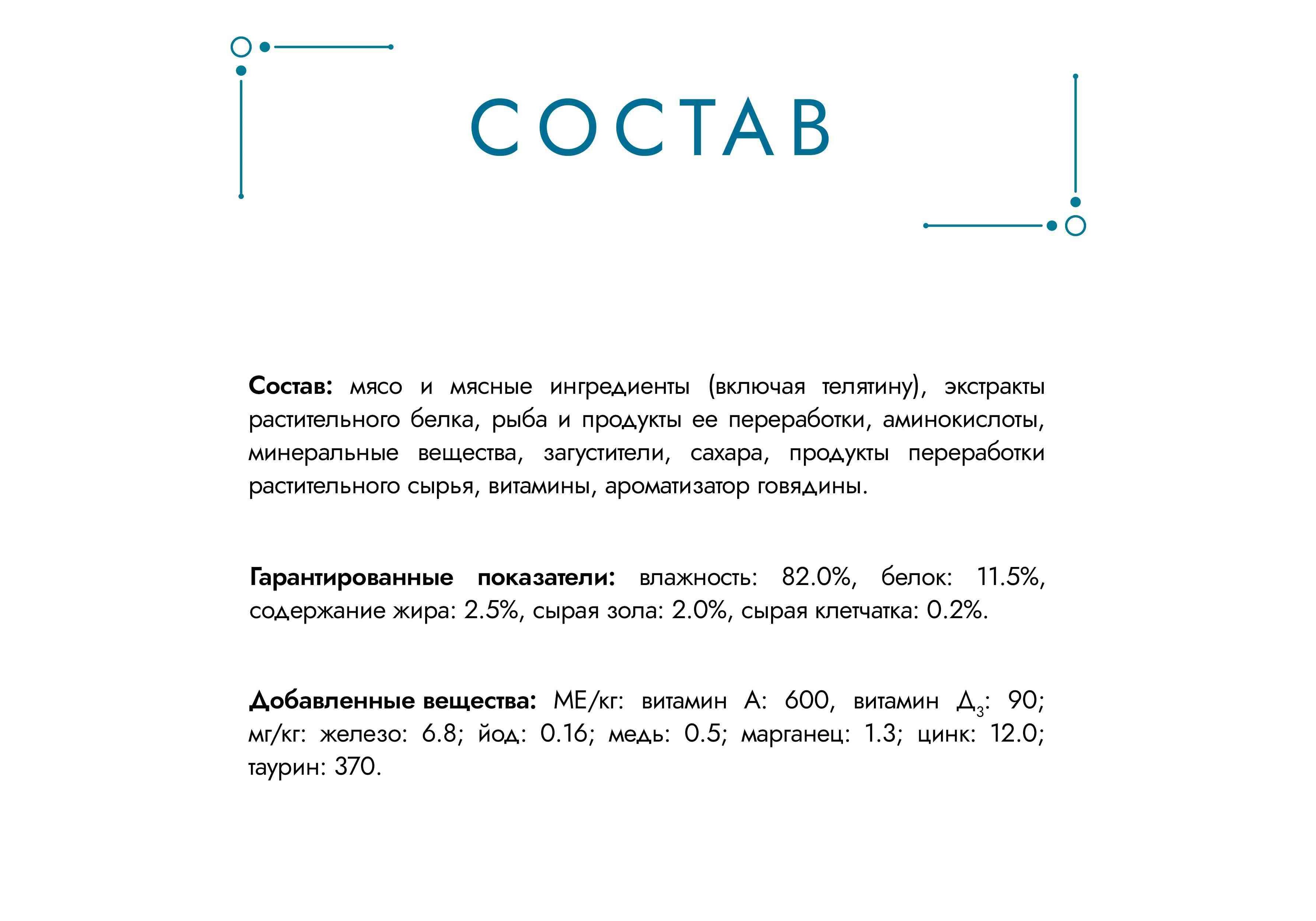 мясо и мясные ингредиенты (включая телятину), экстракты растительного белка, рыба и продукты ее переработки, аминокислоты, минеральные вещества, загустители, сахара, продукты переработки растительного сырья, витамины, ароматизатор говядины.