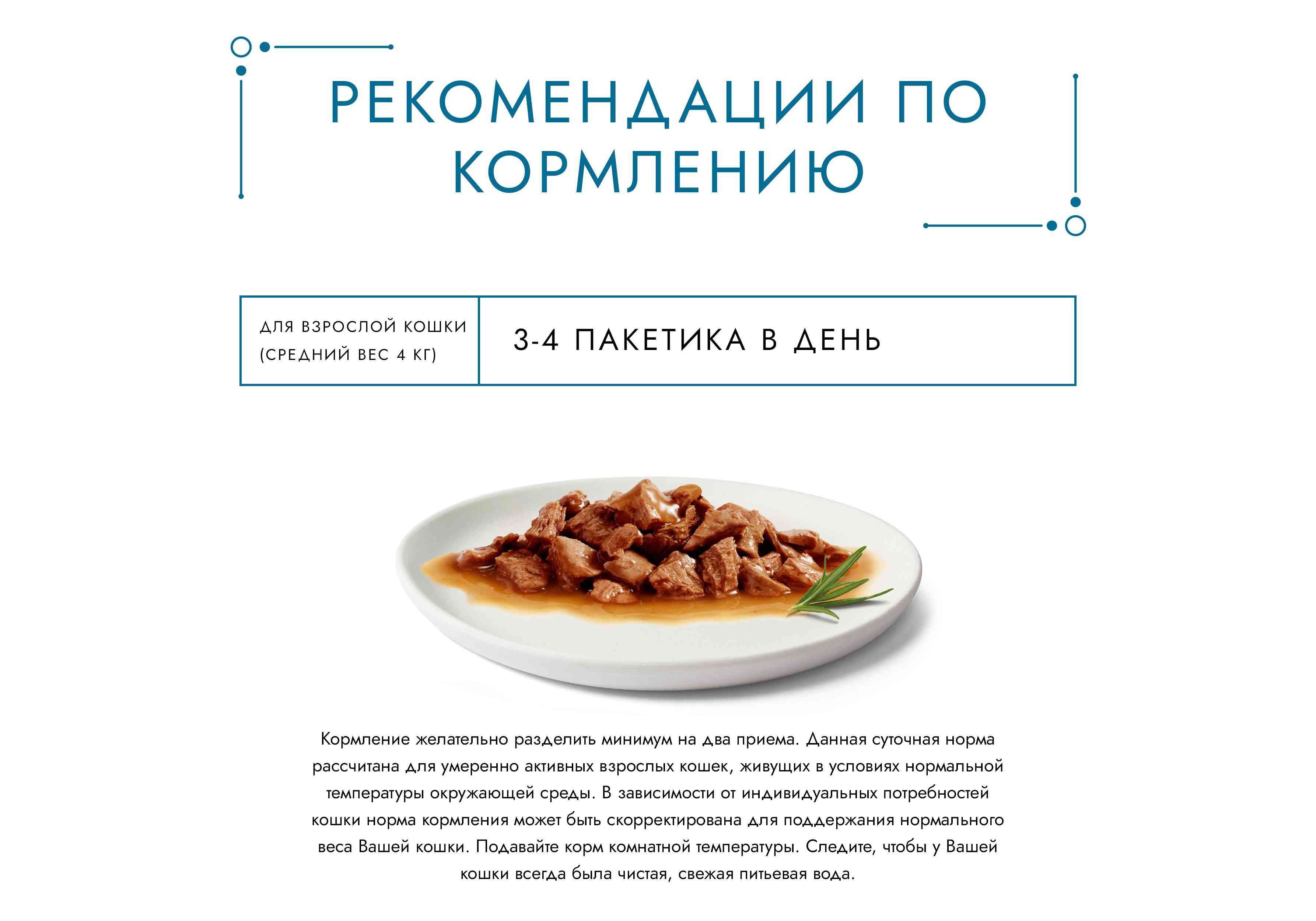 Для взрослой кошки среднего веса (4 кг) требуется 3-4 пакетика в день. Кормление желательно разделить минимум на два приема.