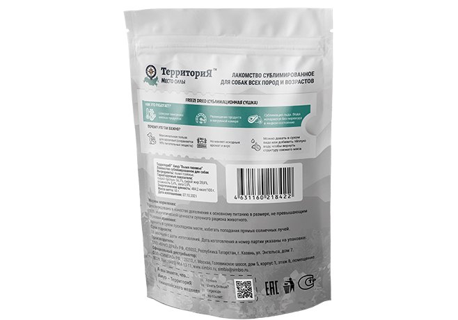 Нативное лакомство, созданное по технологии freeze-drying (сублимационная сушка). Все ингредиенты для лакомств ТерриториЯ™ поступают на производство в свежем виде. Там для сохранения своих полезных свойств они проходят сверхбыстрое замораживание. Затем в вакуумной камере происходит процесс сублимации, в результате чего замёрзшая влага в ингредиентах испаряется без перехода в жидкое состояние. Это значит, что удаляется только вода, а лакомство сохраняет все свои полезные свойства.