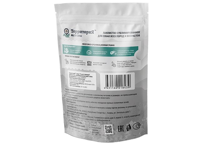 Нативное лакомство, созданное по технологии freeze-drying (сублимационная сушка). Все ингредиенты для лакомств ТерриториЯ™ поступают на производство в свежем виде. Там для сохранения своих полезных свойств они проходят сверхбыстрое замораживание. Затем в вакуумной камере происходит процесс сублимации, в результате чего замёрзшая влага в ингредиентах испаряется без перехода в жидкое состояние. Это значит, что удаляется только вода, а лакомство сохраняет все свои полезные свойства.