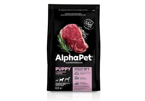 AlphaPet Puppy Superpremium Сухой корм АльфаПет для Щенков, беременных и кормящих собак Средних пород Говядина рис 900 г