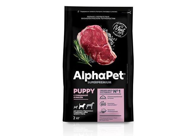 AlphaPet Puppy Superpremium Сухой корм АльфаПет для Щенков, беременных и кормящих собак Средних пород Говядина рис 2 кг