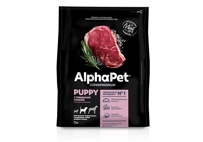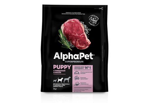 AlphaPet Puppy Superpremium Сухой корм АльфаПет для Щенков, беременных и кормящих собак Средних пород Говядина рис 7 кг