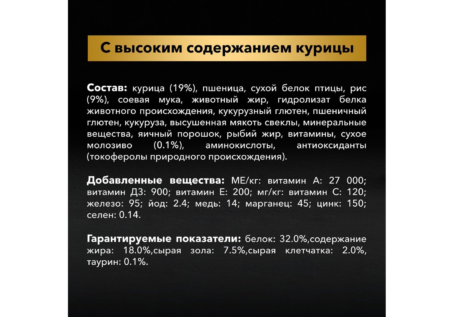 Курица (19%), пшеница, сухой белок птицы, рис (9%), животный жир, кукуруза, пшеничный глютен, вкусоароматическая кормовая добавка, кукурузный глютен, сухая мякоть свеклы, продукты переработки растительного сырья, минеральные вещества, яичный порошок, рыбий жир, витамины, молозиво (0,1%), аминокислоты, антиоксиданты (токоферолы природного происхождения). ДОБАВЛЕННЫЕ ВЕЩЕСТВА МЕ/кг: витамин A 27 000; витамин D3 900; витамин E 200; витамин C 120 мг/кг; железо 79 мг/кг; йод 2,0 мг/кг; медь 12 мг/кг; марганец 37 мг/кг; цинк 150 мг/кг; селен 0,13 мг/кг. ГАРАНТИРОВАННЫЕ ПОКАЗАТЕЛИ Белок 32%, жир 18%, сырая зола 7,5%, сырая клетчатка 2%, таурин 0,1 %.PRO PLAN® от РURINA® — это 100% сбалансированное рационы высокого качества для поддержания здоровья Ваших питомцев на всех этапах их жизни.