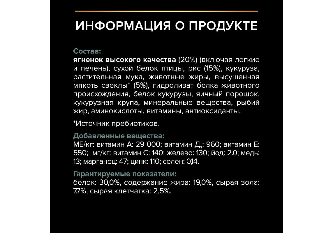 Ягненок высокого качества (включая легкие и печень) (20%), сухой белок птицы, рис (15%), кукуруза, растительная мука, животные жиры, высушенная мякоть свеклы* (5%), гидролизат белка животного происхождения, белок кукурузы, яичный порошок, кукурузная крупа, минеральные вещества, рыбий жир, аминокислоты, витамины, антиоксиданты.