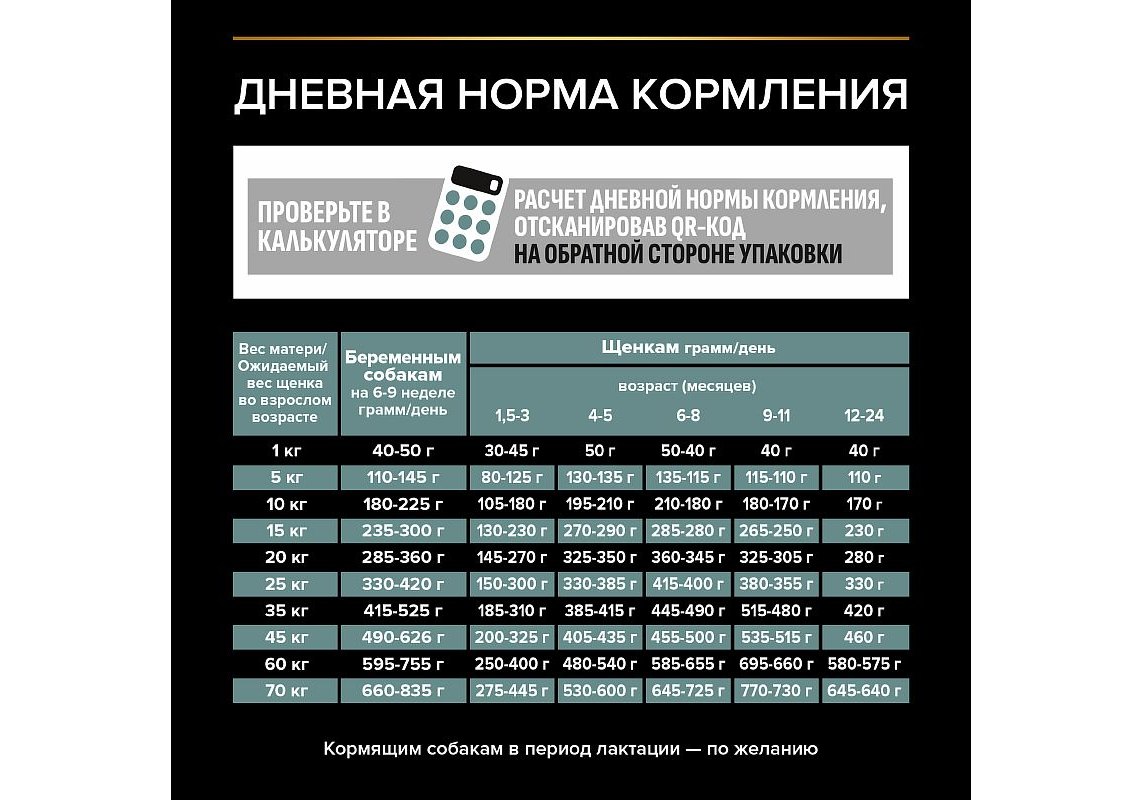 Кормление в период роста: с 3 по 6 неделю начинайте давать размоченный корм Pro Plan® 3–4 раза в день. После полного прекращения кормления материнским молоком кормите согласно таблице. По достижении трехмесячного возраста постепенно снижайте количество воды, добавляемой для размачивания корма. Поддержание оптимальной массы тела очень важно для здоровья вашего щенка. Рекомендуемая суточная норма может варьироваться в зависимости от уровня активности, физических особенностей и индивидуальных потребностей вашего щенка. Следите, чтобы у собаки всегда была чистая, свежая питьевая вода. Для контроля здоровья вашей собаки обращайтесь в ветеринарную клинику на регулярной основе.