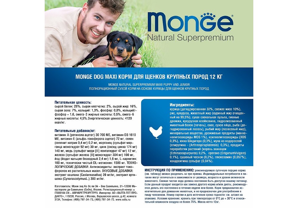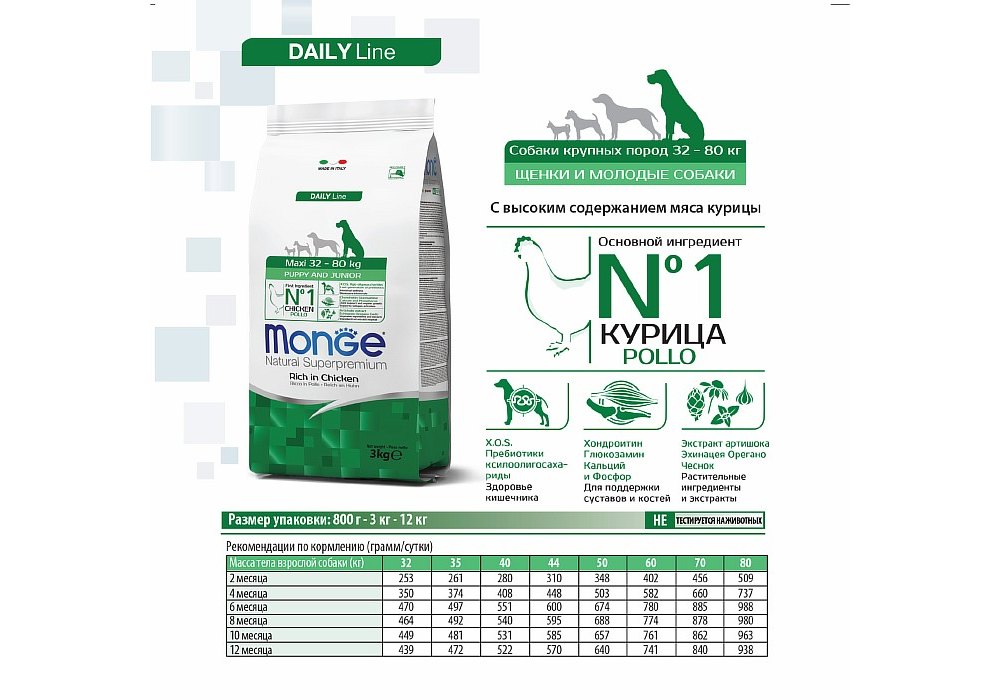 Рекомендации по кормлению: щенкам в возрасте от 2 до 12 месяцев размачивать продукт теплой водой за несколько минут до кормления. Суточная норма должна быть разделена на 3-4 кормления. Суточная норма может варьироваться в зависимости от индивидуальных потребностей животного. Важно, чтобы у животного всегда была свежая питьевая вода.