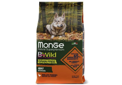 Monge Dog BWild Grain Free Adult All Breeds Duck Сухой Беззерновой корм Монж Бивайлд для взрослых собак всех пород Утка картофель 2,5 кг