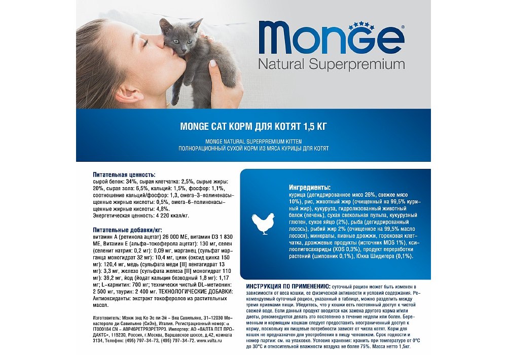 Рекомендации по кормлению: не ограничивайте количество корма или соблюдайте указанную на упаковке суточную норму. ВАЖНО, чтобы животное всегда имело доступ к чистой, свежей воде. Суточную норму необходимо разделить на 2-3 кормления. Не рекомендуется ограничивать количество корма лактирующим кошкам.