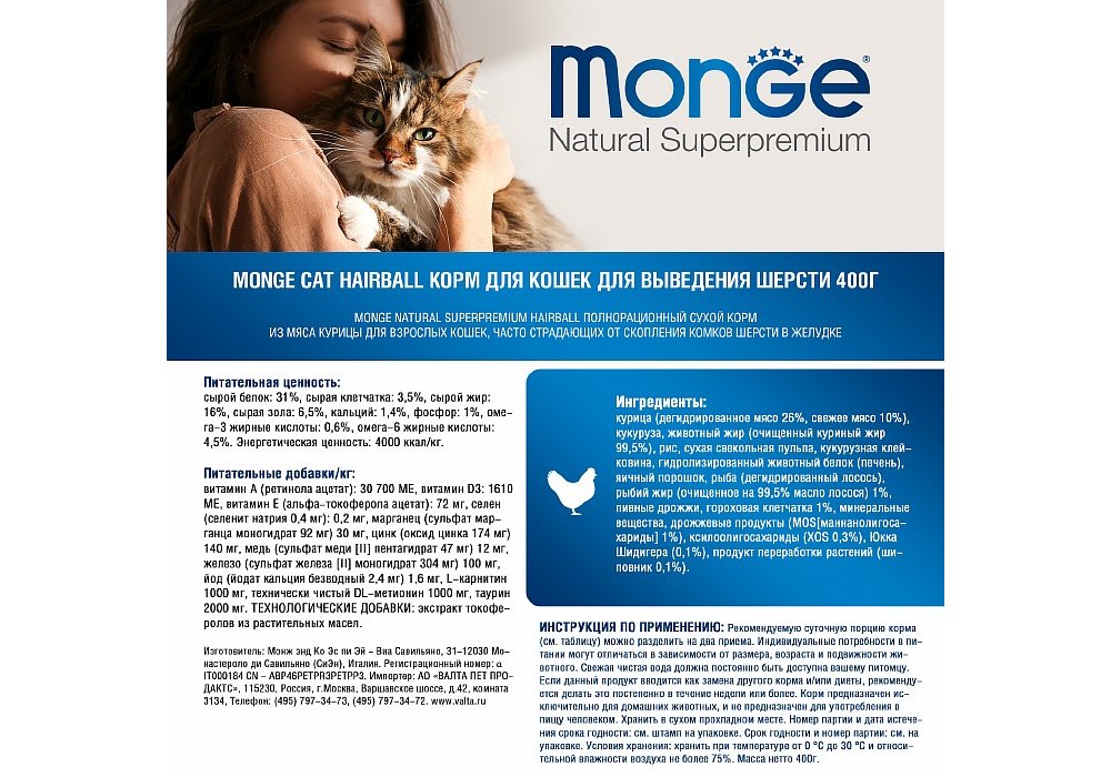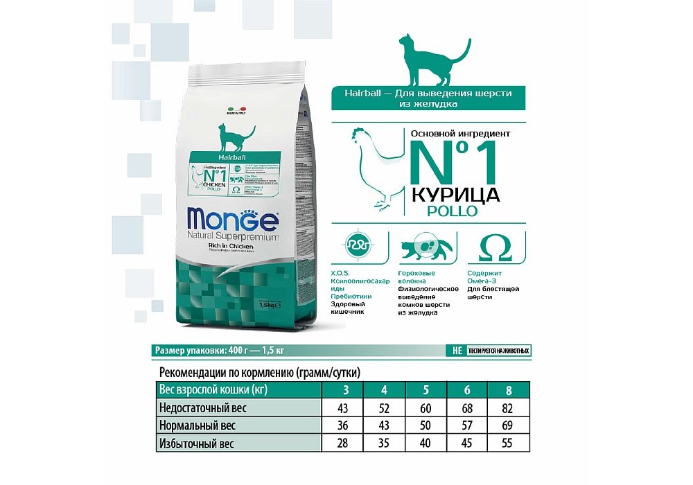 Рекомендации по кормлению: не ограничивайте количество корма. Кошка будет съедать столько корма, сколько необходимо для поддержания оптимального веса. При избыточном весе и/или наличии других проблем, рекомендуется ограничивать суточную норму корма в соответствии с рекомендациями ветеринарного врача и/или следовать приведенной на упаковке таблице. ВАЖНО, чтобы животное всегда имело доступ к чистой, свежей воде.