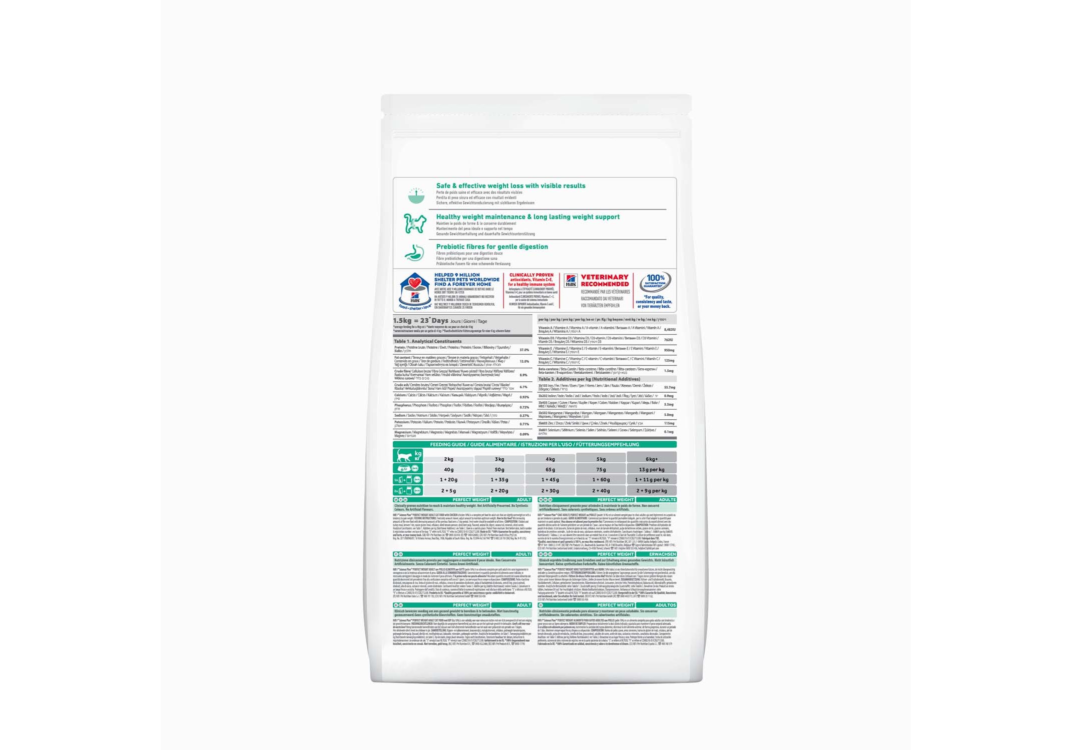 Неважно есть ли у вашей кошки заметные проблемы с избыточным весом или вы просто хотите поддержать ее нормальный вес, сухой корм для взрослых кошек , склонных к избыточному весу, с курицей HILL'S SCIENCE PLAN Perfect Weight - это тщательно сбалансированное питание для малоподвижных кошек, нуждающихся с низкокалорийном питании и контроле веса. Корм изготовлен из высококачественных ингредиентов, содержащих меньше калорий, а также содержит L-карнитин для поддержания идеального веса у вашейвзрослой кошки. Качественные протеины и натуральные пищевые волокна помогают вашей кошке оставаться сытой между кормлениями, а Витамин Е и Омега-6 жирные кислоты питают кожу и обеспечивают блестящую шерсть.