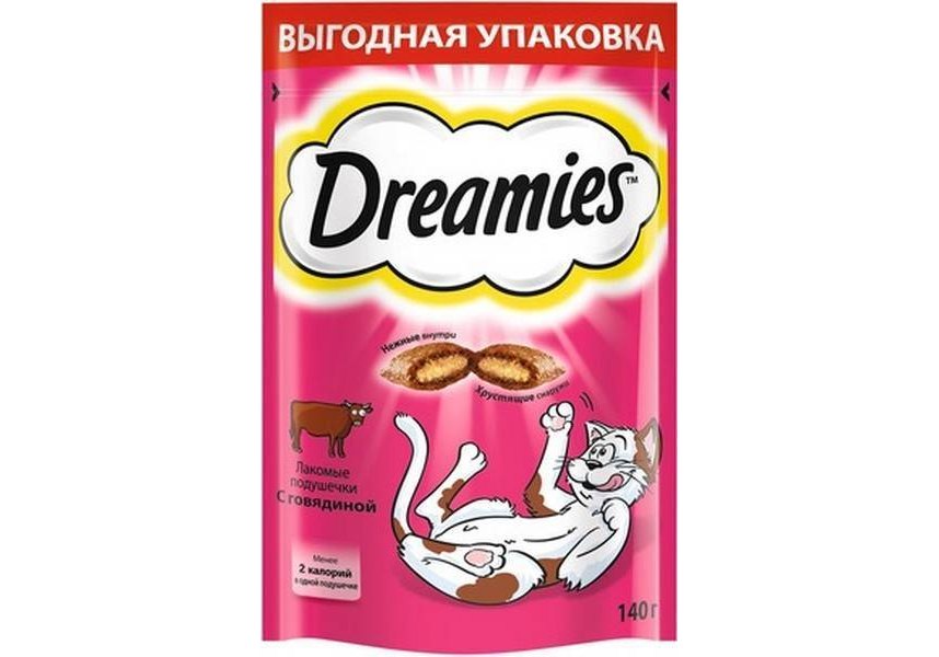 Dreamies с говядиной – настоящее мясное лакомство для вашего питомца! Покажите вашему коту эту упаковку нежных внутри и хрустящих снаружи подушечек, и он будет в восторге. Устройте ему настоящий праздник мяса!