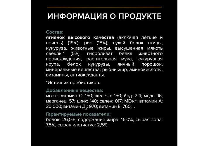 Ягненок высокого качества (включая легкие и печень) (19%), рис (18%), сухой белок птицы, кукуруза, животные жиры, высушенная мякоть свеклы* (5%), гидролизат белка животного происхождения, растительная мука, кукурузная крупа, белок кукурузы, яичный порошок, минеральные вещества, рыбий жир, аминокислоты, витамины, антиоксиданты.