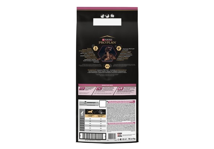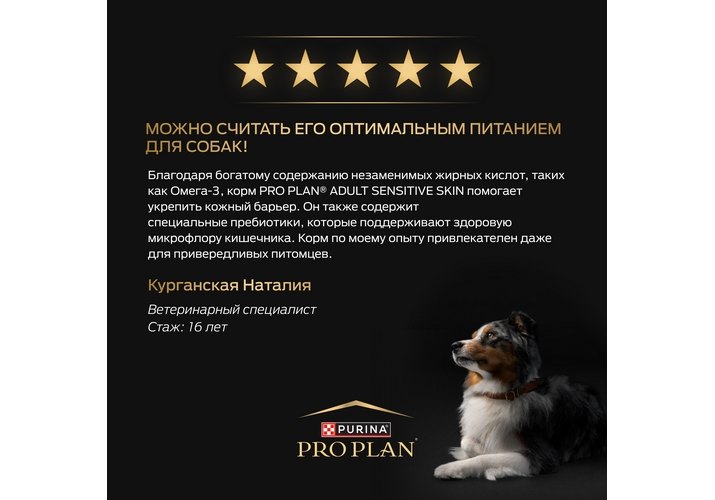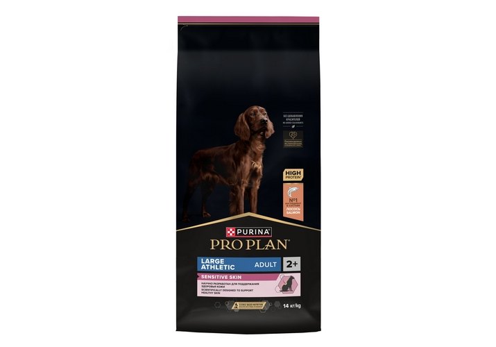Изучая потребности собак на протяжении многих лет, команда квалифицированных ветеринарных специалистов и диетологов PURINA разработала сухой корм PRO PLAN® Sensitive skin (для чувствительной кожи) — ежедневный рацион с высоким содержанием лосося для взрослых собак крупных пород с атлетическим телосложением. Этот полнорационный корм сбалансирован по составу и помогает поддерживать здоровье чувствительной кожи.