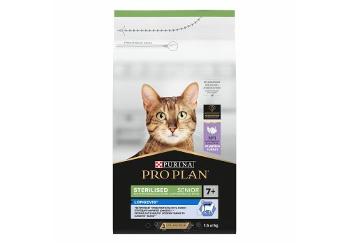 Команда квалифицированных ветеринарных специалистов и диетологов разработала корм для стерилизованных кошек сухой с индейкой серии PRO PLAN® Sterilised LONGEVIS для стерилизованных кошек старше 7 лет. Этот сбалансированный корм для кошек легко усваивается и обеспечивает организм пожилых питомцев всеми питательными веществами, необходимыми для поддержания их здоровья и активности в любом возрасте.
