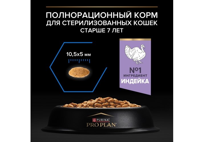 Команда квалифицированных ветеринарных специалистов и диетологов разработала корм для стерилизованных кошек сухой с индейкой серии PRO PLAN® Sterilised LONGEVIS для стерилизованных кошек старше 7 лет. Этот сбалансированный корм для кошек легко усваивается и обеспечивает организм пожилых питомцев всеми питательными веществами, необходимыми для поддержания их здоровья и активности в любом возрасте.