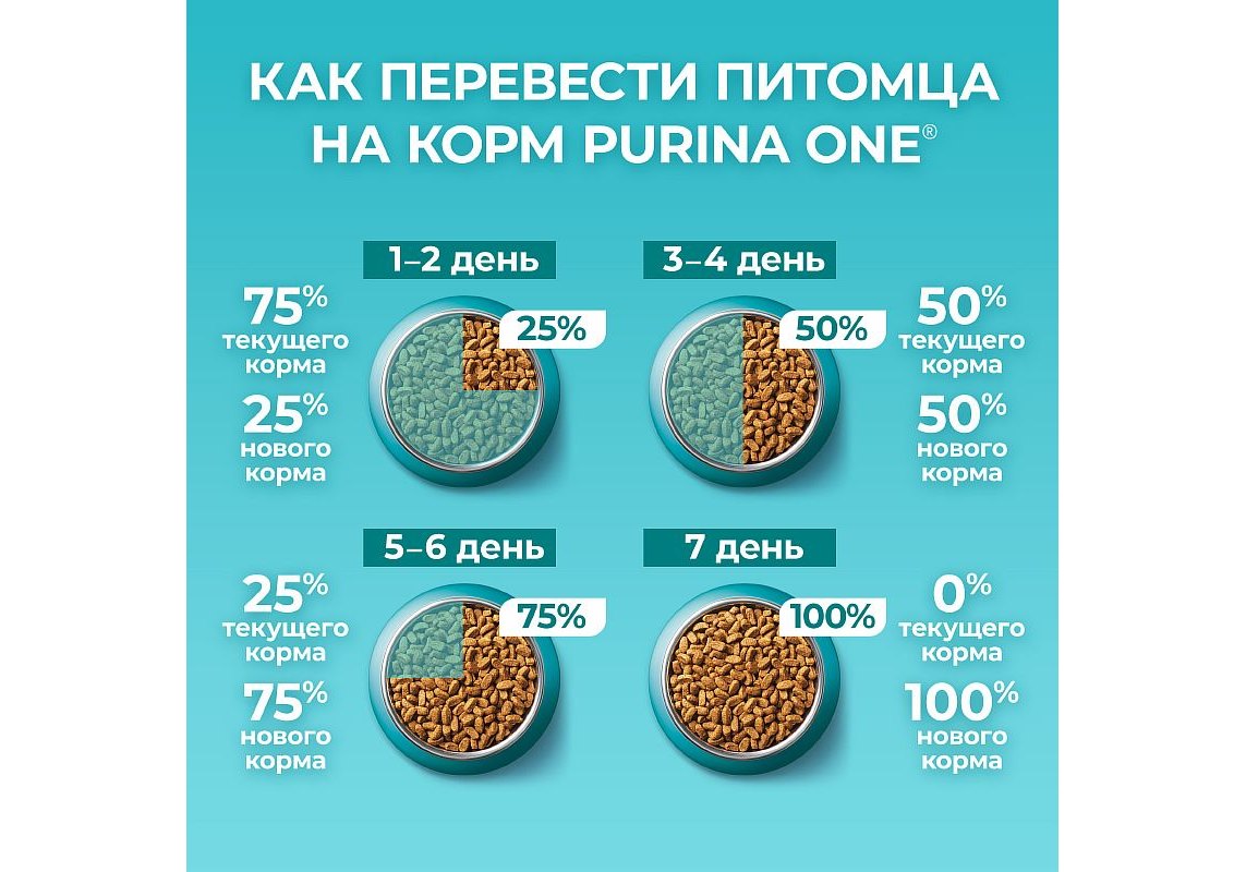 Если вы предлагаете вашей кошке корм Purina ONE® (Пурина Уан) впервые, рекомендуем переводить на новый корм постепенно. В течение 7 дней уменьшайте исходный рацион, увеличивая дозу корма Purina ONE® (Пурина Уан). Это позволит пищеварительной системе вашей кошки лучше адаптироваться к изменению корма.