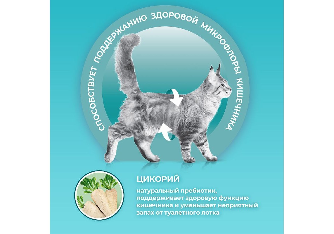 • В составе натуральный пребиотик — цикорий, который поддерживает функцию кишечника и уменьшает неприятный запах от туалетного лотка**