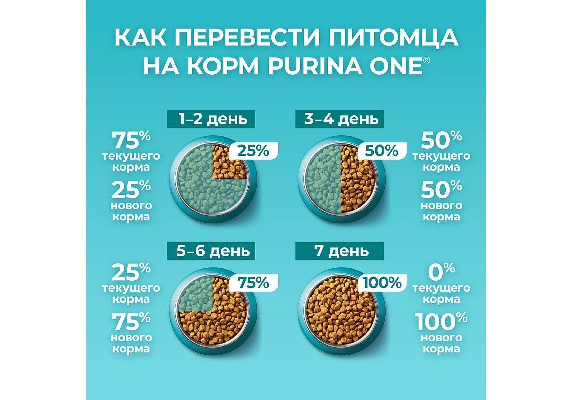 Если вы предлагаете Вашей кошке корм Purina ONE® (Пурина Уан) впервые, рекомендуем переводить на новый корм постепенно. В течение 7 дней уменьшайте исходный рацион, увеличивая дозу корма. Это позволит пищеварительной системе Вашей кошки лучше адаптироваться к изменению корма.