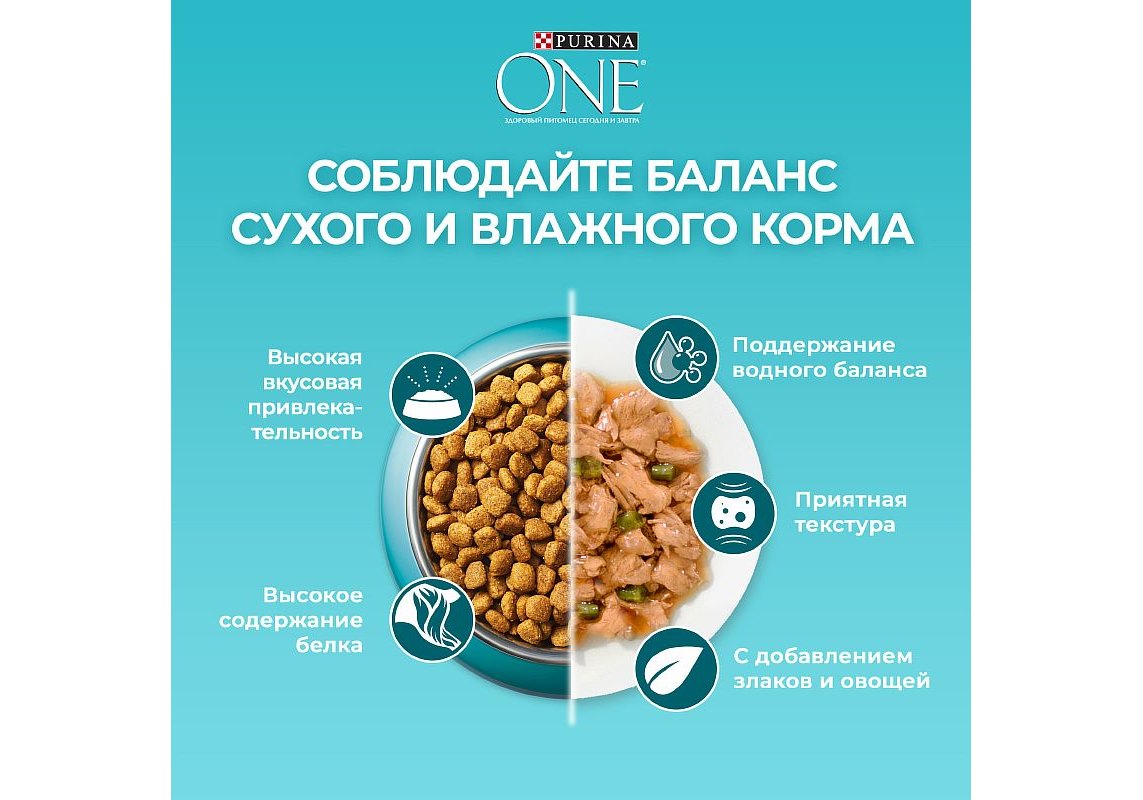Сочетание сухого и влажного корма Purina ONE® обеспечивает сбалансированное питание и гарантированную пользу.
