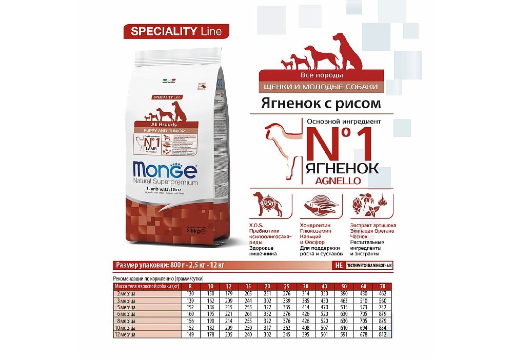 Указания по применению: для щенков в возрасте от 2 до 12 месяцев. Продукт можно использовать в сухом или размоченном в теплой воде виде. Необходимо разделить дневной рацион на 3–4 порции. Количество может изменяться в зависимости от физиологических потребностей животного.