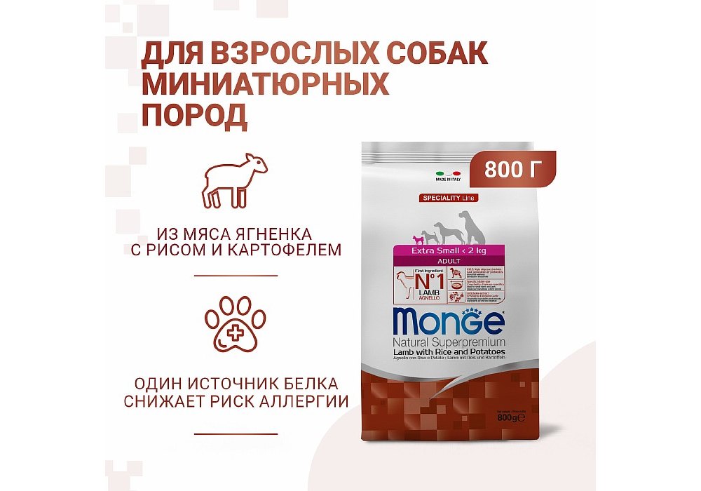 Monge Dog Speciality Extra Small Lamb & Rice Сухой корм Монж Спешиалити для взрослых собак Миниатюрных пород Ягненок с рисом и картофелем 800 г