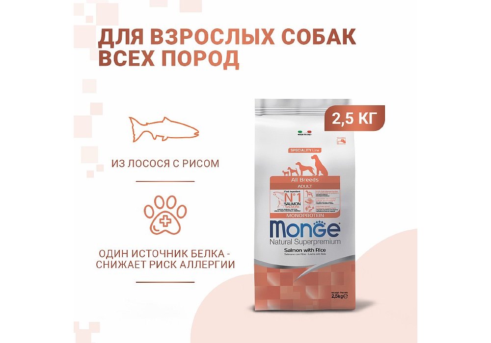 Monge Dog Monoprotein Speciality Adult Salmon & Rice Сухой корм Монж для взрослых собак всех пород Лосось с рисом 2,5 кг