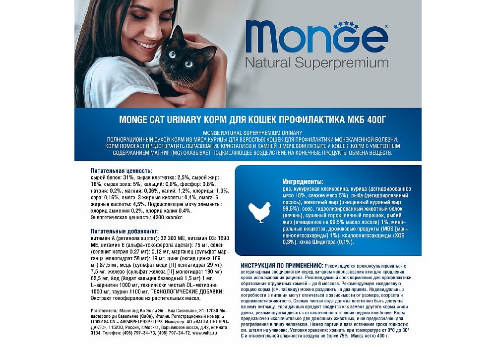 Рекомендации по кормлению: не ограничивайте количество корма. Кошка будет съедать столько корма, сколько необходимо для поддержания оптимального веса. При избыточном весе и/или наличии других проблем, рекомендуется ограничивать суточную норму корма в соответствии с рекомендациями ветеринарного врача и/или следовать приведенной на упаковке таблице. ВАЖНО, чтобы животное всегда имело доступ к чистой, свежей воде.