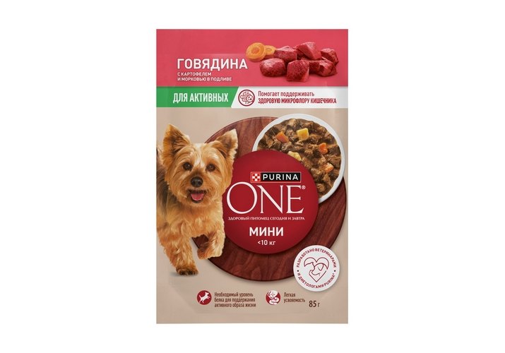 • Влажный корм для собак PURINA ONE® с говядиной является 100% полнорационным и сбалансированным питанием
