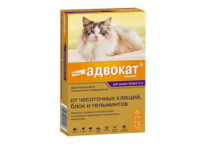 Elanco Адвокат Капли на холку от Чесоточных Клещей, Блох и Гельминтов для кошек весом 4-8 кг 3шт x 0,8мл