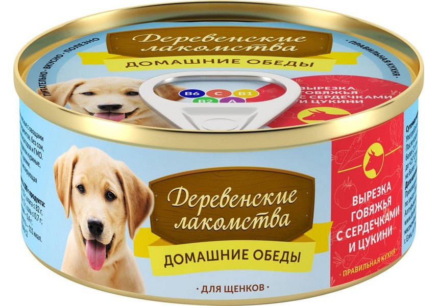 Деревенские лакомства Домашние обеды Консервы для Щенков Вырезка Говяжья с Сердечками и Цукини (цена за упаковку) 100г х 5шт