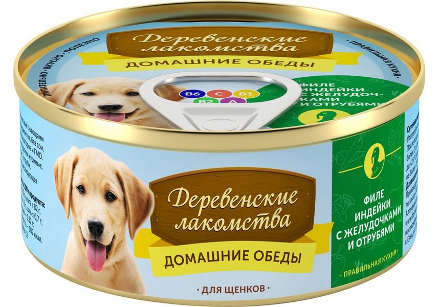 Деревенские лакомства Домашние обеды Консервы для Щенков Филе Индейки с Желудочками и Отрубями (цена за упаковку) 100г х 5шт