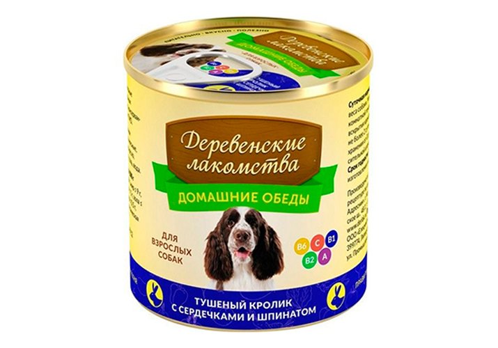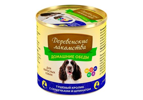 Деревенские лакомства Домашние обеды Консервы для взрослых собак Тушеный Кролик с Сердечками и Шпинатом (цена за упаковку) 240г х 6шт