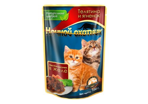 Ночной охотник Влажный корм Паучи для Котят Телятина и Ягненок в желе (цена за упаковку) 100г х 24шт