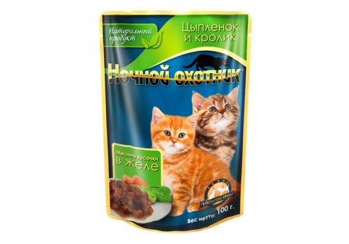 Ночной охотник Влажный корм Паучи для Котят Цыпленок и Кролик в желе (цена за упаковку) 100г х 24шт