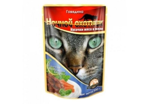 Ночной охотник Влажный корм Паучи для кошек Говядина кусочки в желе (цена за упаковку) 100г х 24шт
